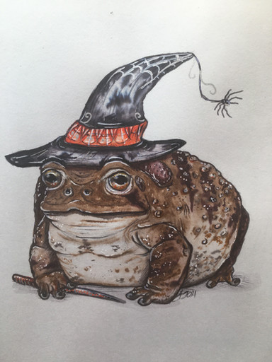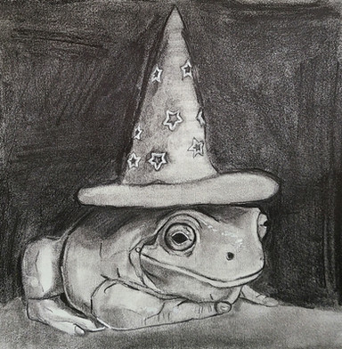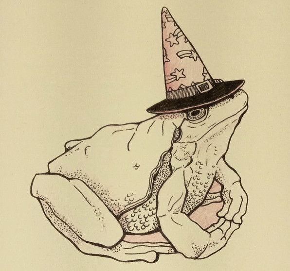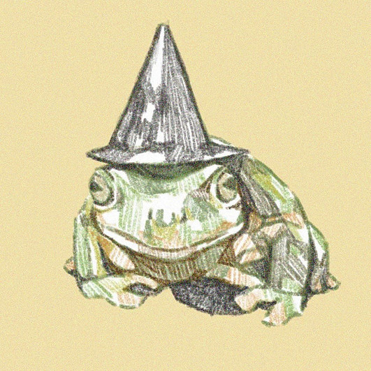 A wizard frog, or maybe just a silly frog with a big hat. Either way, I bet they store all the magic in the hatA5, coloured pencils, 2021