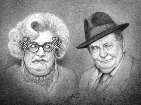 A miniature graphite drawing on paper.Two scandal mongers are scanning the newspaper for juicy items. (I think they may've found something!)