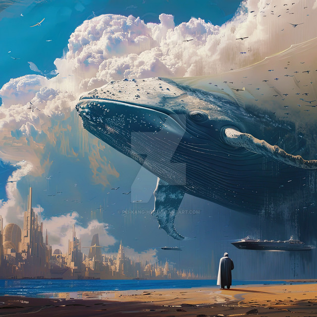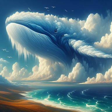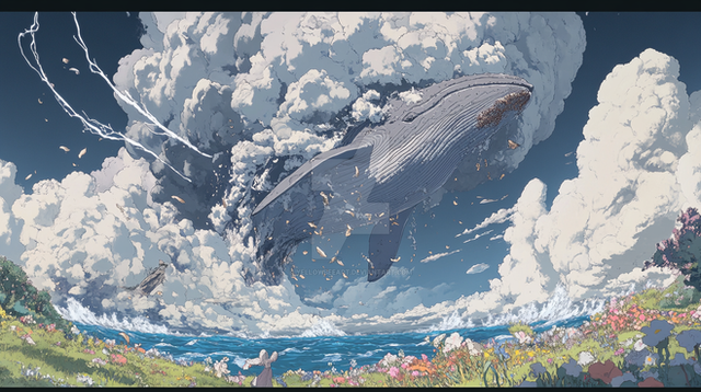 A flying whale in the clouds. Many images depciting whales flying in the sky inspired me to create this render. It's a very common theme isn't it? - flying whales. A lot of anime themed images have this kind of subject matter. I also love how anime depicts clouds, it's probably one of my favourite aspects of that style, so I wanted to show that here.There were a lot of things that kind of went wrong during the creation of this scene. I initially thought that the cloud work was going to be simple. At first I just placed a lot of mandelbulbs and clumped them together. This looked really unusual and made me realise that it required more planning than I thought.