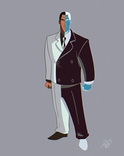 Easily one of the best-handled villains in Batman The Animated Series. Harvey's origin was deftly handled, introducing him as a friend of Bruce Wayne who had already shown signs of a split personality. His scarring merely provided the push that drive him into villainy. I absolutely love the design; the stark black and white, the Harvey side clearly drawing influence from Robert Mitchum, the monster side a stylized horror character.Related content