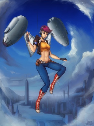 This is my air elemental. She has air intakes on her abdomen that takes in air straight to her lungs. Instead of exhaling carbon dioxide, she exhales magic tinted air from her mouth. She can manipulate this magic breath. She created an apparatus to funnel her breath into balloons and air spigots which she can use for flight. She can also use the finger mounted spigots to give life to her mechanical creations, such as little Cosmo here. Hope you guys like this one, its the last of the four.PhotoshopCS3: 10-12 hours or so
