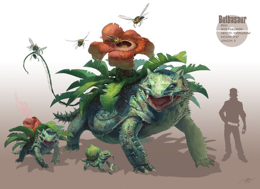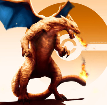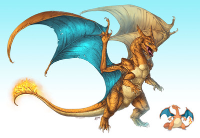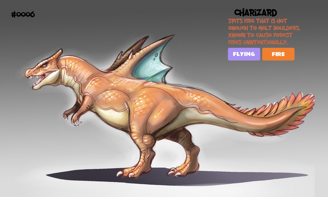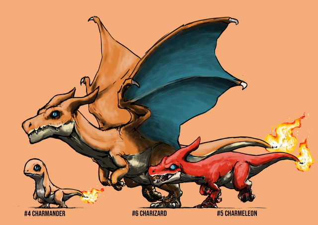Though Bulbasaur has always been my favorite Pokemon, Charizard has always been my favorite fully evolved starter. I even had a Charizard Pokemon card back when that was a big deal. I wanted to make sure he looked reptilian not saurischian, so I pulled design elements exclusively from reptiles. You guys should definitely check out a Kaprosuchus, it certainly wouldn't be a boar. I also made sure to add little wing nubs on the pre-evs so that its not as jarring a transition. As Charizards get older, more or their tail envelops in flame. When a Charizard reaches an old enough age it will completely ignite and burn itself to ash. There are responsible for the occasional brush fire.