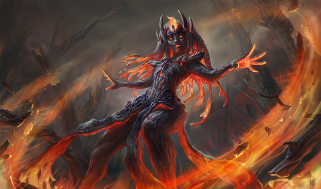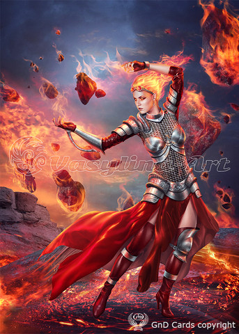 This is way, way too completely awesome. The volcanic ash rising in the background, the splintering rock underneath her feet with glowing magma peeking through, and her hair, like glowing cords of molten metal. Her young features make her striking but terrible at the same time - perfect to represent Fire.