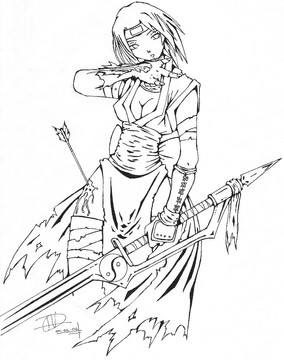 Okay, enough about boobies. @_@ I do love her outfit here! Very pretty! And her hair. Wonderful details on the sword too. I would say go with purple colors and maybe some darker yellows, like on the bow.