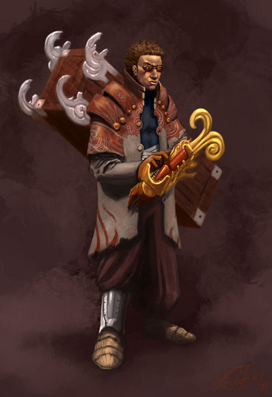 Heres a character concept that was inspired by a really windy and rainy walk home one night. You know how when its raining really hard and the wind is blowing you start to have to wield your umbrella like a shield with both hands. Thats kinda what i was thinking.He is a guide to help people through very harsh terrain. I figure his umbrella is to deal with as of yet undecided dangerous falling rocks or heavy rain. The trigger on his umbrella opens the shield, havent decided if it fires anything yet. Tried to make him pretty douchey as well, he is a real asshole.