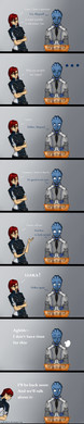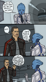 Haha, poor Liara. She just went through a lot to get Shepard up and running and now Shepard adds some more pressure to the already frustrated friend. Oh well, that's what you get for "Shadow Broker spamming" when you have no idea what to say next!