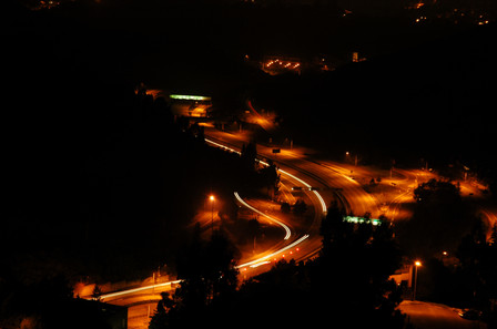 A twilight shot of Nashville's I-65/Briley Parkway interchange, along with the cityscape.