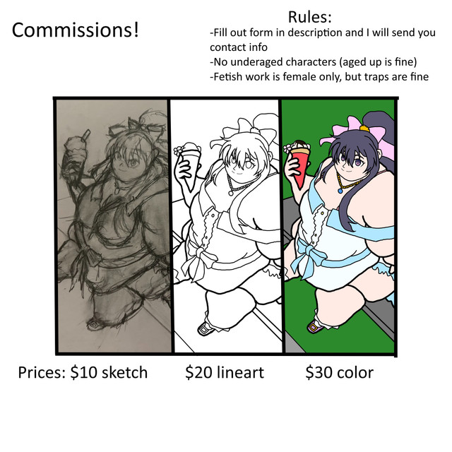 It's that time again! This time, I'm now offering colored commissions in addition to my usual sketch comms. The prices are on the image of course, but I'll list them here too:Portraits - $30/sketch, $60/colored