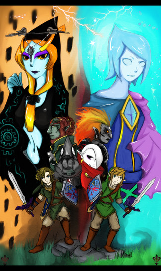 I like how Zelda's colors are quite warm-toned so the cool background makes quite a nice contrast, and vice versa for Midna. I should have added something like Hyrule castle and Twilight Palace in the background, but I didn't figure that out until now. XD Too bad.