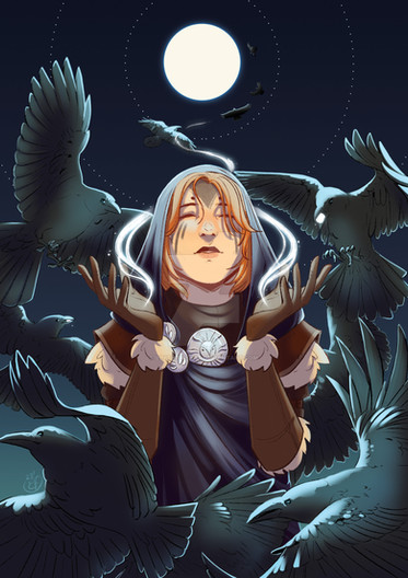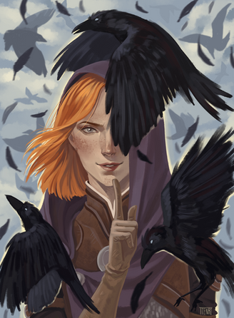 This came out great! You've done a good job balancing that mix of beauty and strength that Leliana has, and the framing of the raven and the stained glass is quite inspired. Well done!