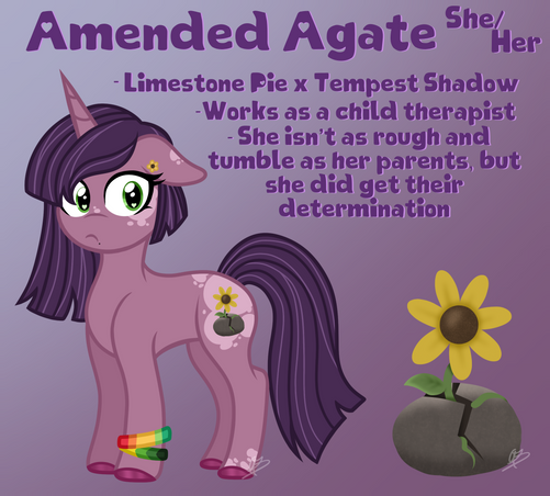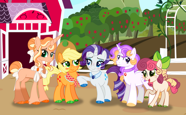 She started to get to know Sunburst more after he became affiliated with the school of friendship as vice headmare. He had no place to stay at first, so she offered a spare room for him to stay in for a short while. He quickly became a part of the apple family and while he tried to help, there wasn’t much he could do, but AJ found it endearing and quickly developed a crush on the unicorn. They planned lessons together and enjoyed each others company. When Granny Smith became really ill, AJ decided to step down from teaching and made taking care of her and the farm her priority. Sunburst helped by taking over her class and bringing over care packages whenever he got the chance. Granny knew about her crush and blurted out how they should marry before she got to sick. AJ and Sunburst were quite embarrassed by the comment but Sunburst agreed and they became official. They got married before Granny Smith passed away as she asked, but she never got to see her great-grandchildren. They have three kids who they love very much, and while they are both very busy ponies, they try to make time for them!!