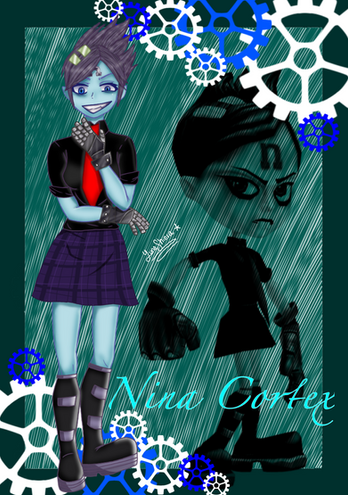 My style (also said by other people) Nina is around 17, stands slightly taller than average (taller than Crash, Coco, N. Gin, Neo and Brio) and is less bratty than the new one in the games. She is probably more street smart and mischievious rather than intellectual, still likes to get her way but rather deal with the 'goodie goods' herself instead of using minions like the Scientists. She is a bit of a tomboy and attends Academy of Evil as a senior. She still thinks of herself as the 'Queen' but acts more like a Bully towards the nerds and younger students.
