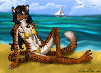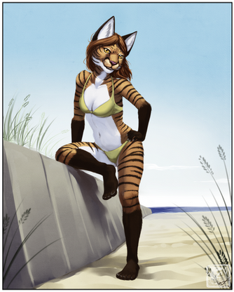 Commissioned by drivernjax ! A character in one of his stories - Amanda's a red fox/tiger hybrid. Pose based on the pinup of Betty Grable.Check out his page for the story of this character sometime in the future!