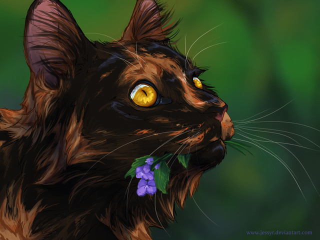 I think the purpose of this character was to be forever-out-of-reach type of thing, since she was so likable but died so soon in the series. She appears so often in visions and dreams but is as unreachable as ever, and even if she had lived she would be isolated by the life of a medicine cat. So what I wanted was a sort of ephemeral feel to this but it's a bit above my skill level at the moment so I played around with lighting instead.