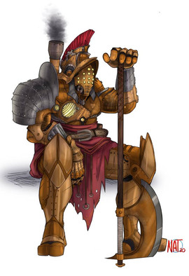 Really well done on the metal, making it look like it was processed with skill for a sheen but not modern day which would make it very smooth. I like the name 'Sir Rattle' it gives him character and I imagine he's not entirely silent while walking around. Really cool idea about the weapon too. I can clearly see how the hand guard is squeezed towards the handle to slide the locking mechanism open.