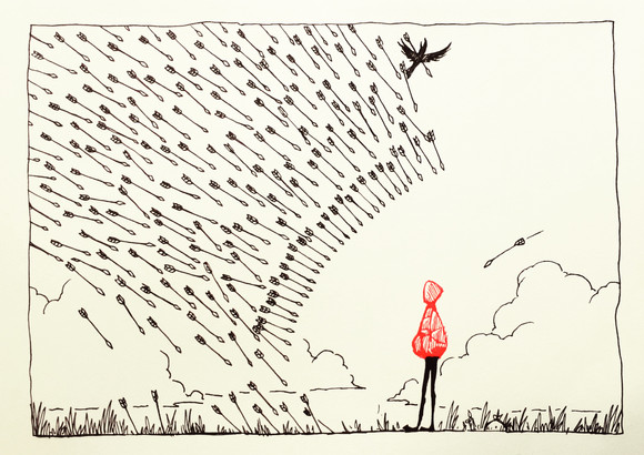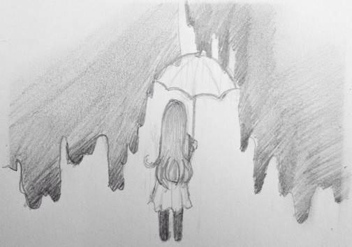 I simply adore this! So completely simple and yet sooooo evocative! I love the choice to make the rain red. And even though you have a remarkably simple figure, you convey so much personality with those slumped shoulders and posture. Also loving the little red droplets, especially as they are used to define the white pace that is the top of the umbrella. And that little bit of thickness to the border beneath the figure? Brilliant. (Also interesting that of all your rain lines, they are all solid except for two of them, one on each side of the figure.) I really LOVE this piece.