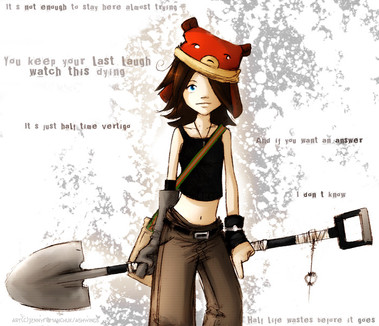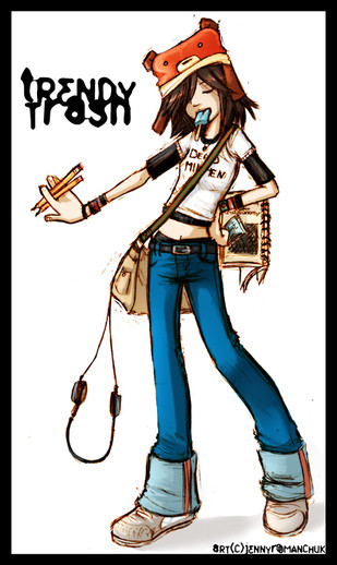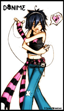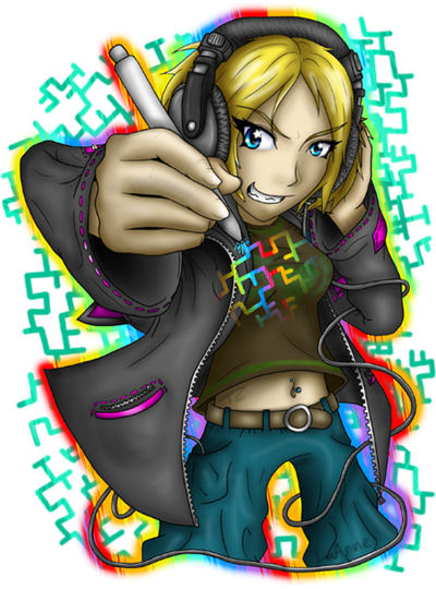 I ADORE the hair, and the thoughtful expression on her face!! and the headphones are perfect, of course.. and the long cord.. thats just awesome the way it's layed-out! and the words on her shirt are a great touch!!!