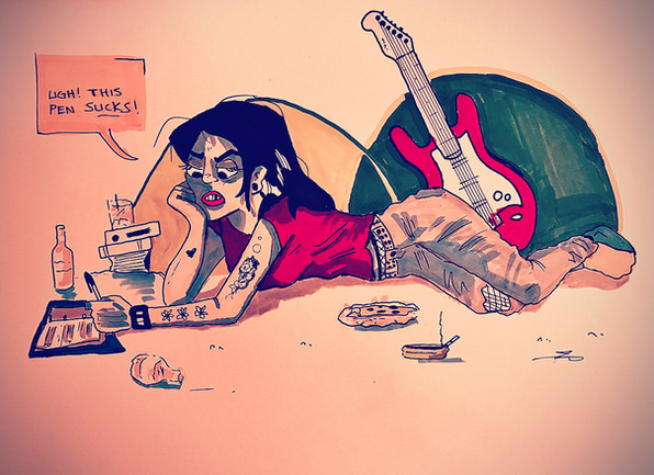 Love the unique illustration style this piece has. I tend to use a lot of black and dark lineart in my drawings, so seeing you manage to do without is very refreshing. The patterns all over the drawing are also very visually interesting and lovely: the back of the red chair, the tile floor, the squares on the wall, the striped pinks socks. Great work on the perspective as well.