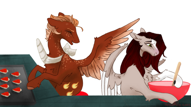 After tying back their hair and washing their hands, they put on some aprons and started preparation. With Willow's gentle guidance, Bubble combined the ingredients and mixed them together in the bowl. Willow watched as Bubble worked diligently and surprisingly focused on her task, for how hyper active the filly normally is.