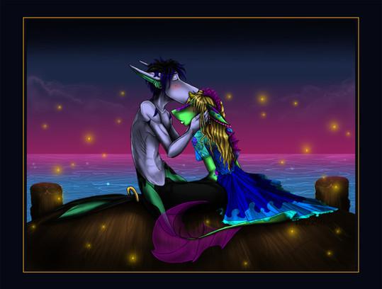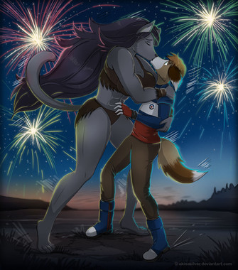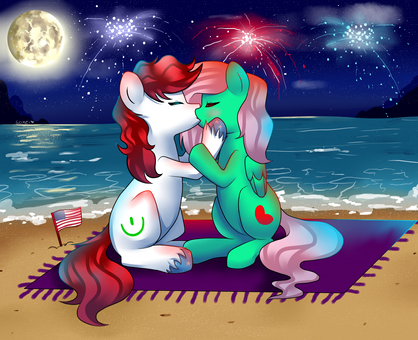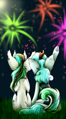 The firework finale would go off, and slowly fizzle. Cheering and applause could be heard from the docks, signaling that it had ended. Hearing the fireworks finish, theyΒ would slowly pull away, looking sweetly into each others eyes. Mako gently wrapped a arm around Bubble's waist, bringing her in close. Time would pass as they gave sweet nuzzles and kisses.