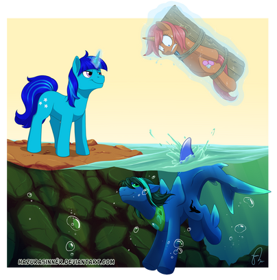After reuniting with long lost relatives , having a rough run in with a grouchy surfer and a clingy octo-pony , getting introduced to a fiery c̶h̶i̶h̶u̶a̶h̶u̶a̶ dragon-pony , and not handling it as smoothly as they could have .... Mako and Bubble decided to put that chaotic week behind them and move on with their daily lives as best they can. Not long after, Bubble expressed interest in seeing what Mako did for his work. Mako reassured her that it would be rather boring for her, but he agreed to have her come on his boat during on of his daily deep sea treasure hunting trip. Once they reached the designated area, they dropped anchor and Mako dived off the ship, deep into the water.As exciting as some moments were, there were certainly a fair share of dull moments. What seemed like hours passed by where Mako wasn't able to find anything, only coming up briefly for air. Bubble would keep herself occupied as best she can. Eventually her curiosity got the best of her and she went snooping around the ship, finding an old fishing pole and bait box. Having gone fishing plenty of times with her father, Bubble thought it would be at least a productive way to spend her time while waiting. She'd cast off the side of the boat and waited. Every now and again it would feel like she got a bite but nothing hooked. The mare was about to doze off from sheer boredom when suddenly she felt a hard tug on the line. She caught something! Putting everything she had into it, she'd struggled and tugged and pulled before reeling in her catch. With how much it dragged, it must be huge!