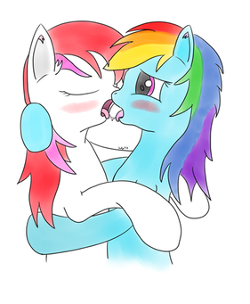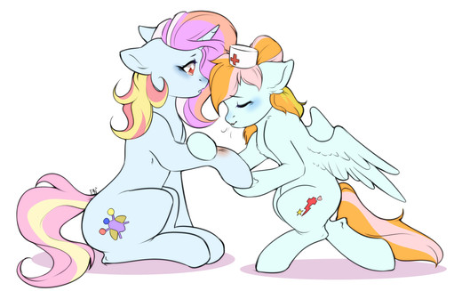 I was inspired by the Kiss Meme that has been floating around. I don't know if I want to do another meme but I couldn't resist the urge to draw more ColoringBook fluff and delve a little deeper into Crayola and Spellbind's background.Now if you didn't know, punching a unicorn in the face hard enough to sent them flying can have some drawbacks. After the whole fiasco, Spellbind had to help bind up Crayola's battered and bruised hand. Unfortunately with this injury, the artist pony won't be creating any new masterpieces for a couple weeks. With a gentle kiss she gave her friend a silent thank you.