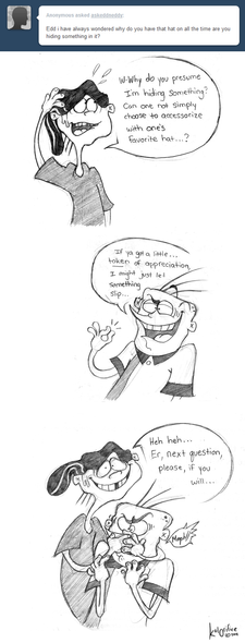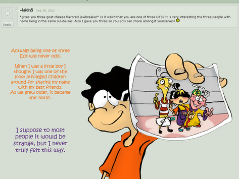 That’s how I see Ed with Double D and Eddy’s relationship. The latter two would NEVER let Ed feel left out. They’ve been together for so long that it would be cruel and disloyal of them to abandon him. All of the intimate questions and requests I’ve drawn so far I consider what they do in private. In public, there’s hardly a difference from when they were kids. Plus, since Ed is dating May, there’s oodles of options for double dates.