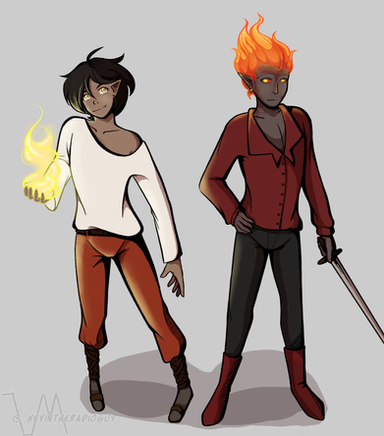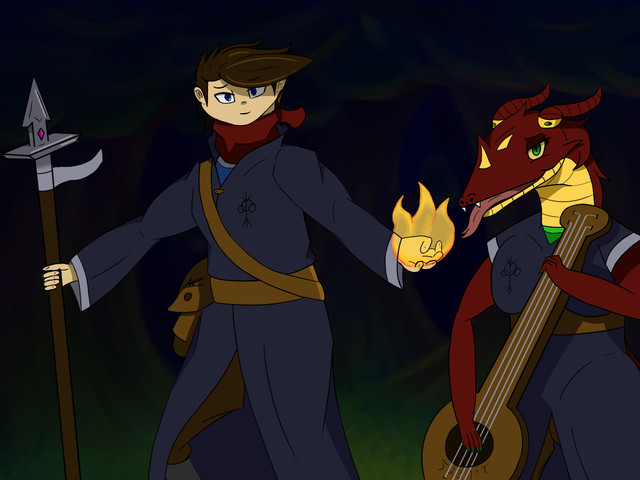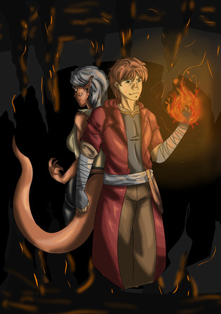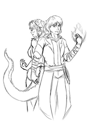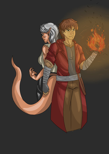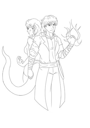#anime #backtoback #boy #dragon #drawing #fantasy #flame #girl #mage #manga #monstergirl #tail #wizard #fire