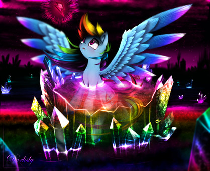The princesses in the crystal give a message of getting free from a cycle or some other symbolic meanings that I'll not get into because it would take forever, but because of that, it's something good to talk about(what does it mean? why are they there?). I also like how the cutie mark seems to be dissolving for the same reasons. The only flaw here is the lack of background to give context, but that can easily be waved off since it gives more rise to the imagination of what is going on than anything.