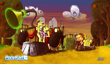 This is extremely lovely and so beautifully alive! Awesome work on the happy sisters. Applejack looks terrific a bit mussed-up and dirty after all the hard work on the go cart, which you also did an amazing job on by the way. I love how even the wheels remind me of cored apple slices (the textures), plus a spoiler for a go cart is hilarious yet cute. Apple Bloom looks perhaps a bit awed at how wonderful it turned out and seems very grateful for her big sister's help. The painting style and shading/highlighting are amazingly good, creating terrific depth to the scene; blur for depth-of-field and helps with that and also puts focus on the sisters and their lean clean machine. It's excellent work down to every little detail. Thanks.