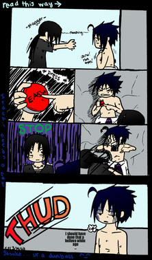 Genin Sasuke and Genin Sakura meet Older Sasuke (from when he defected to Orochimaru) and Genin Sasuke asks 'Why are you dressed like a stripper?' and Genin Sakura comments 'I don't mind~' and older Sasuke gives a wtf face.