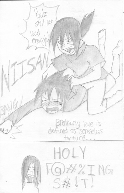 Omgersh.. My sister and I were wrestling.. It all started cuz she pinched me. I ended up dragging her to the floor and testing out the various submissions I had learned in karate class! lolz Every one worked, not to mention being able to flip her every which way and throw in all sorts of odd directions! She was laughing, but glaring because i was yelling that she was 'otouto-chan' the enitre time. She knows it means 'little brother,' so she got upset.. But she enjoyed being treated like a rag doll..Anyway, I ahd her pinned and was alying on her back with my arms around her neck (see flash back in comic!) And the butt LICKED my arm. I ended up locking her up the way Itachi did in the comic and licking her face as payback.
