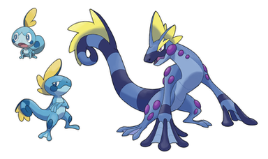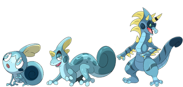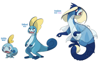 I thought I'd try out a knight theme for the line (since Ive seen a few theories going around about Sobble evolving into a knight).I don't have names for them yet, but I do know that the final form is either Water/Steel or Water/Dragon.