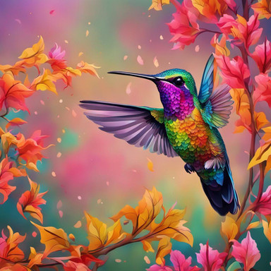 The hummingbird's body is a symphony of hues, ranging from emerald greens to sapphire blues and fiery reds, creating a kaleidoscope that mirrors the vivid tapestry of the natural world. Its wings beat with a rapid, rhythmic cadence, allowing it to defy gravity and move with the agility of a celestial dancer.