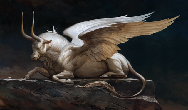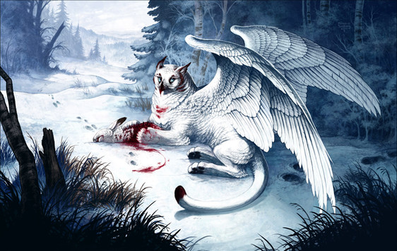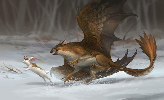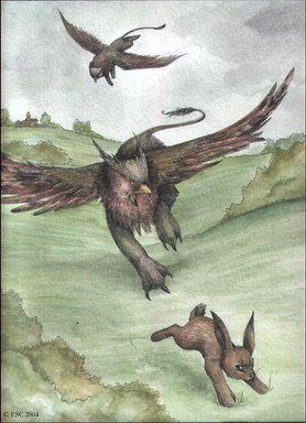 That poor hare. A winged wolf/griffin is a really unfair! Really wonderful painting.