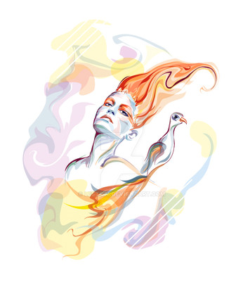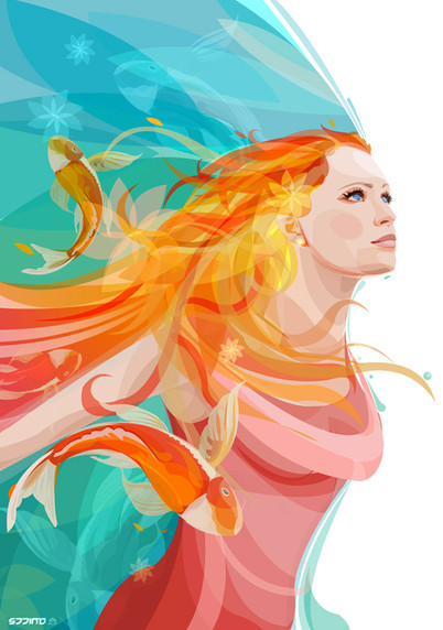 The colors are wonderful, and I adore the little details and ideas; especially the goldfishes and the bird drinking nectar from the flowers in the hair. Amazing work!