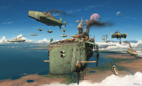 #banners #bridge #celebration #city #clouds #fantasy #military #ships #sky #turrets #aircraft
