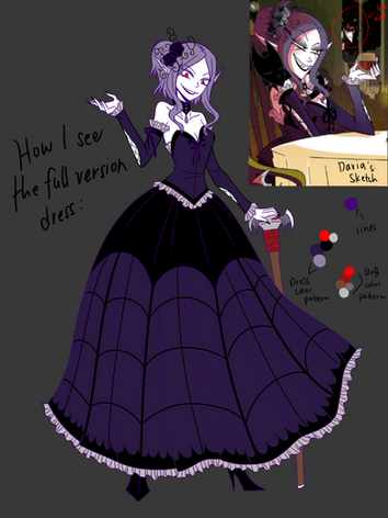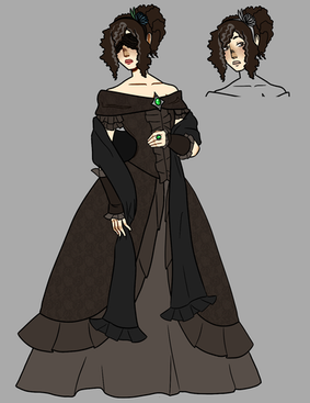 Lilith has two party dresses. she has one that she likes to wear for small parties where she doesn't have to make an appearance as the heir and daughter of Black hat! but she does the her brooch on. it means to much to her to leave it off. but on the other side is her ball gown she has to wear when BH is hosting a party and wants to show off his daughter. he also gets her to wear a hat and vial, he doesn't want to show her off to much. he doesn't want her getting hit on by all the dudes there. he also keeps close to her at parties is nothing happens. she does love both dresses but she doesn't want to be the center of attention like she would be with the ball gown. plus she is very socially awkward so she doesn't mind sticking close to BH or Flug so they can talk for her.Villainous- Alan Ituriel
