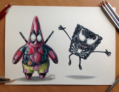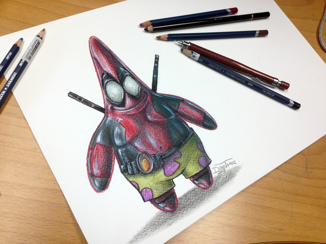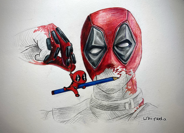 Deadpool drawingJust finished a drawing of Deadpool breaking the 4th wall ( or at least my take on the idea how the character might break the 4th wall ) Its a realistic deadpool holding a cartoon deadpool that is drawing the realistic deadpool haha