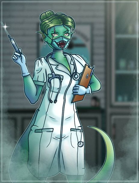 This is one of my few original characters, Monster Nurse Yuukai.I've been building a bit of story around her. She lives in an abandoned hospital and she takes care of all sorts of injured monsters. They are her little babies