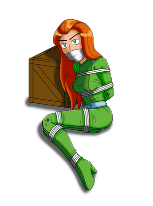 Looking back to all her adventures, Kim had to be honest to herself, because she realised that she enjoy when being tied up in strange ways. So in situations not being able to move and to know there may be no escape from the hands of some cruel and brutal enemy, she always gets really hot. So it was now, when she was tied up wearing her skin tight Latex fightingsuit. She loves it.