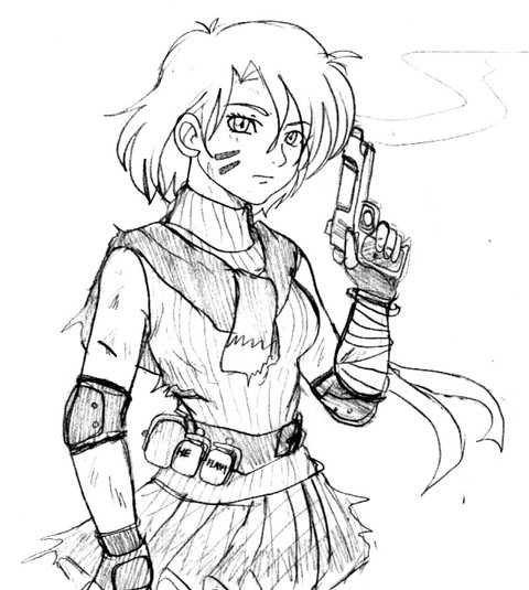 If you're gonna take her any further I'd suggest turning the gun hand to see the side of the gun, the barrel lines up right with her arm, it kind of makes it look like her arm becomes the gun.