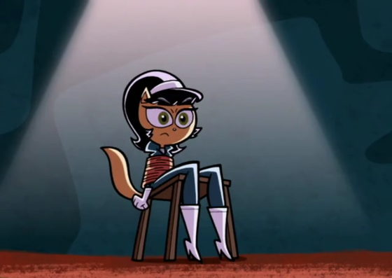 Knowing the logic of the show Kitty probably tired to stop D.O.O.M. from stealing the ticket booth daily profit (about 28 dollar and 60 cent) through a western style stick-up heist (probably from something Snaptrap once saw on TV). But then she ended up getting knocked out (probably by something Dudley did). Then once she wakes up she finds herself in this situation.