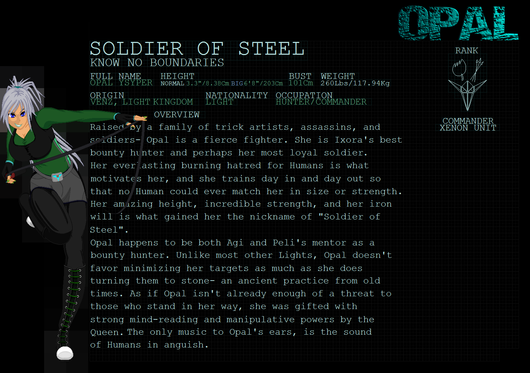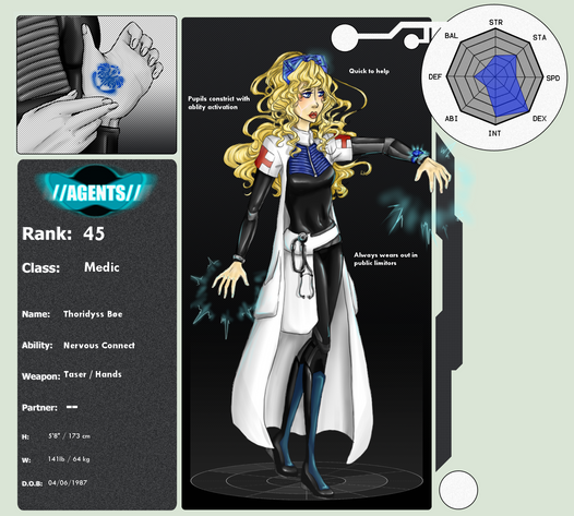 She really does look approachable and friendly somehow. That was before reading profile. The effect of the skirt is so nice. It's like flowy, but you can still see agent uniform. ... though.... how in the world does that work with her wearing pouches on her leg? XD "Let me get your medicine. *lifts skirt up to get at her pouches on her leg*" There's a slit on the side? Because I'm having awkward moment mental images. XD