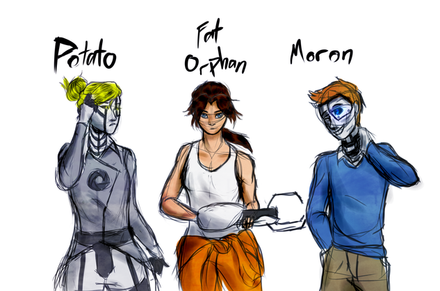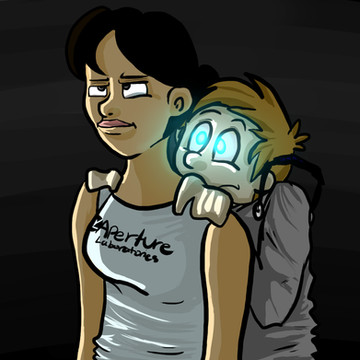 Well...He is certainly not a moron, thaaaat you must admit GLaDOS...Is-is chell blushing or is she just a bit drunk O_o? Anyway love it! The smug expression on wheatley's face is so well chosen...and the lil' smirk on Chell's face...cuuute...