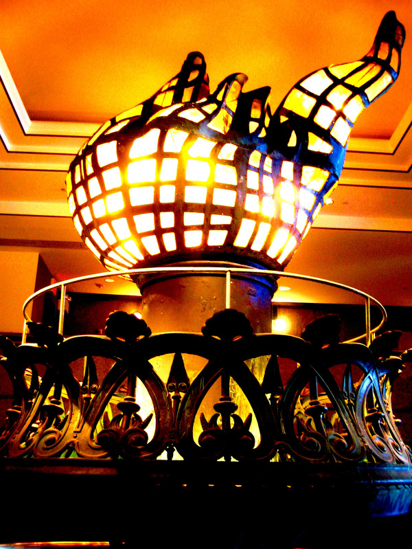 This is situated at the lower lobby within the statue of Liberty. It's the original 1886 torch, gold plated and illuminated with lights from the inside.