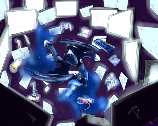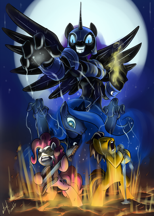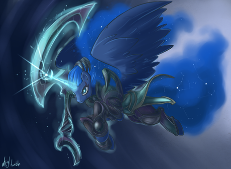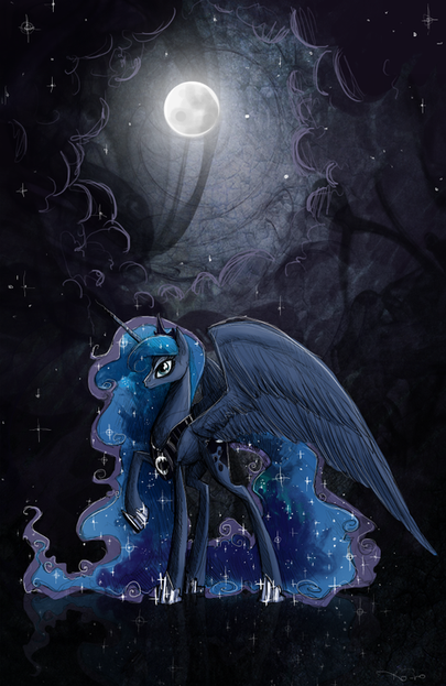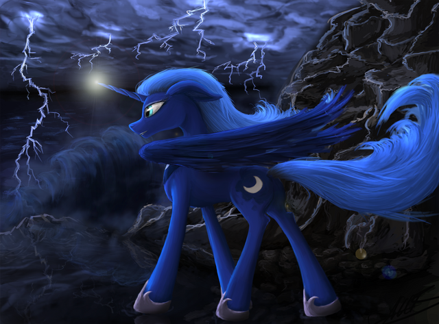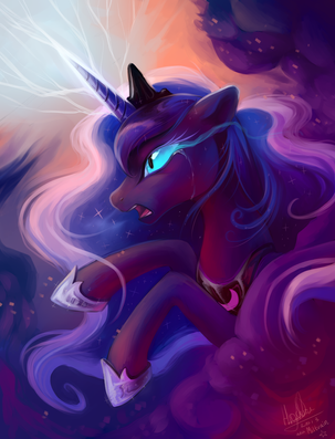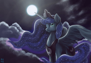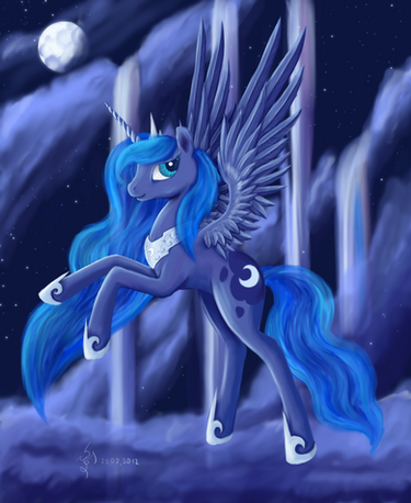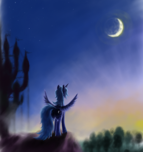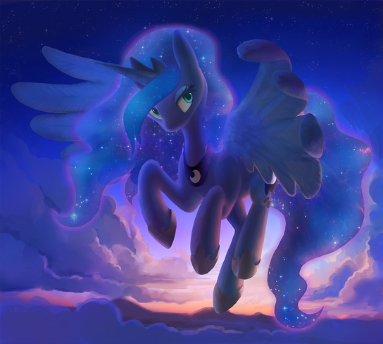 manipulating the clouds to give that warm ambiance that you would like to enjoy sleeping during the day is truly amazing in this piece, at first i assumed that this is the boundary between the earth and the moon as the spot luna is standing on reminds me of a crater on the moon, this piece portrays that she is standing on a platform on the sea? good work on using luna's mane (the Front side) to pierce through the sky to show the elegance of the stars