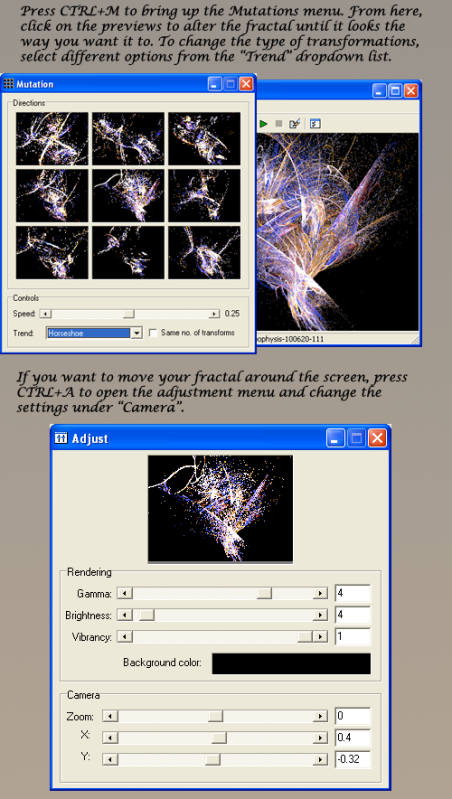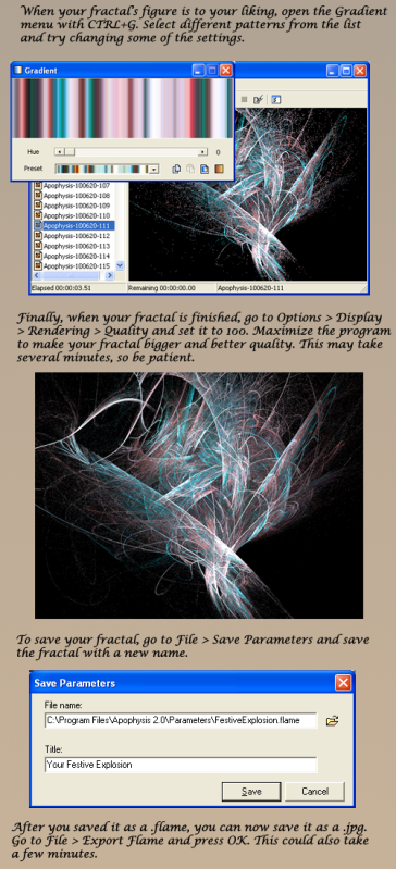 I used Apophysis 2.02 for the tutorial, but it should work with newer versions as well. You can see the final fractal I made here: [link]