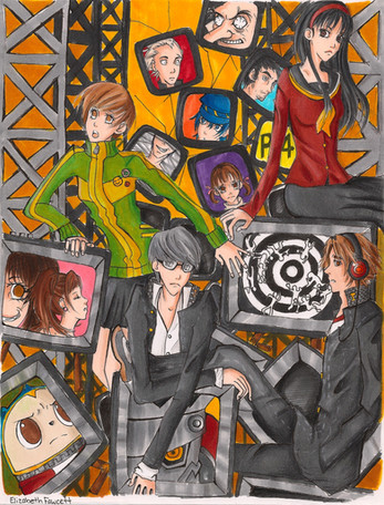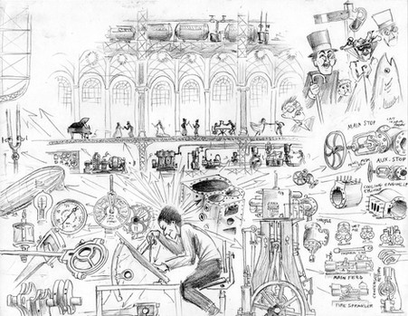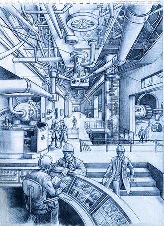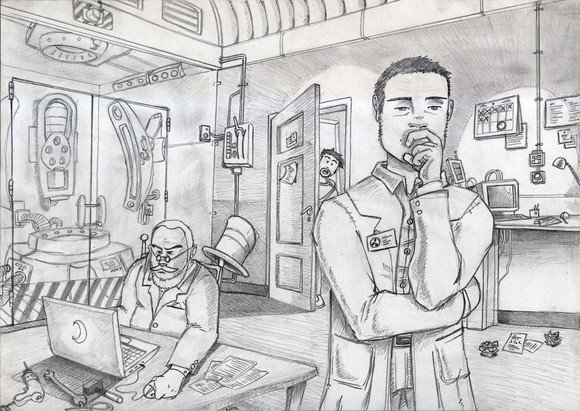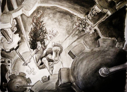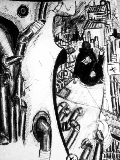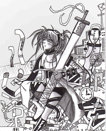 This is an art assignment I did for art class. Basically, we could do whatever we wanted to and that is exactly why so many things are going on in this illustration.This was originally done with colored copics and pencils but the colors clashed with the gray machinery. Thus I turned it into a gray scale composition on the computer. Yup.