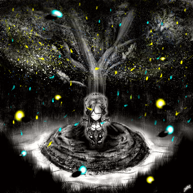 She didn’t care though. Not anymore. It had been a long time since she had felt anything a all, at least other than feeling bored. ‘Heartless’. It was what a lot of people called her, their hushed whispers they thought she couldn’t hear from the confines of her small and grey cottage were never ignored, and she knew they meant it quite literally. The hole in her chest, taking a form of a love-heart, showed that inside she really was just a mess. Inside it dripped darkness and nothing else. Strands of pain and apathy were constant reminder that she was lacking the most important thing of all, and it made her very obviously not-human. By human standards it was positively grotesque. Those strands and drips would run through her and eventually fall from the bottom of her dress and onto the ground below. The droplets drained colour wherever they landed, an obvious problem looking at the home she stood in. Years of living with the shadows that fell had rendered most of the inside and outside of her home grey, literally. The fireplace was the only real source of colour in the room, bathing the living room in a warm, orange glow, growing brighter and warmer with every long and arduous minute that passed for her.